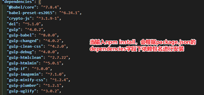 输入命令npm install gulp -ES留意package.json 文件的 dependencies 字段,以看出版本号中的^**消失了。
