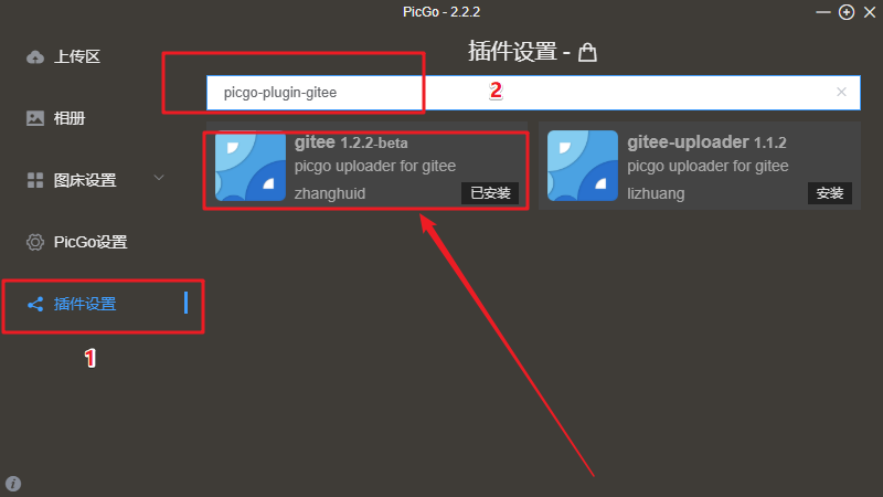 2. 接着打开软件,点击软件界面中的插件设置,然后进行搜索:输入内容:picgo-plugin-gitee,你会发现,有两个插件,我选择的是第一种,第二种我后面会说到。然后选择图中所指向的插件。