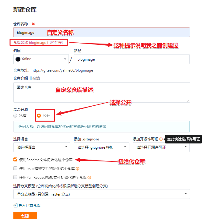 打开码云官方网站,进入你的个人仓库界面,新建仓库,如何新建仓库的详细步骤我就不说了,相信搭建都会,直接上一张图,图中有文字说明:
