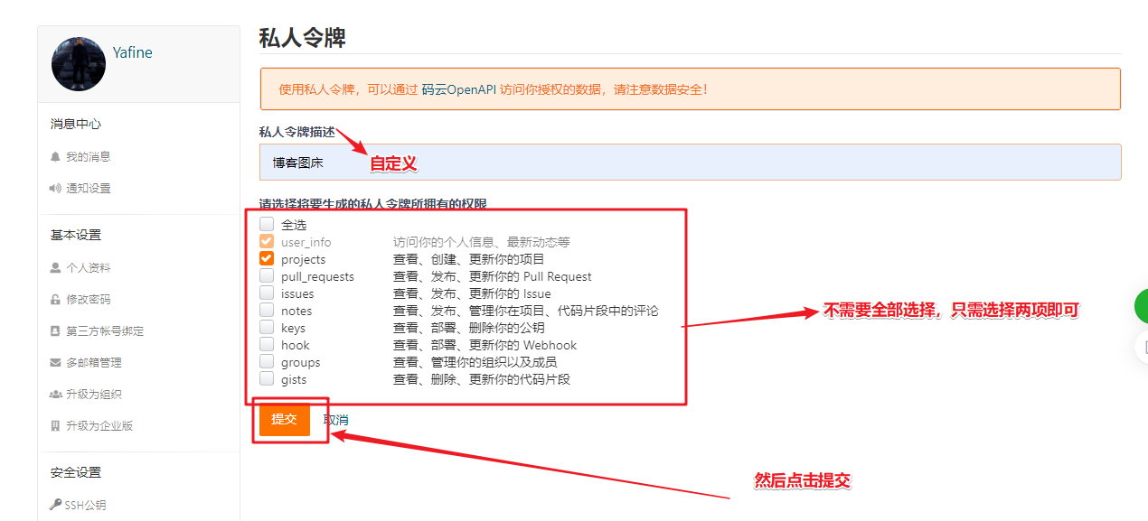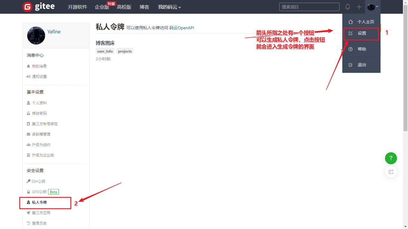 设置 -> 私人令牌 -> 生成新令牌