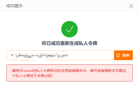 提交后,会提示你输入密码进行验证,验证成功后,会有提示框,提示框中的内容即为私人令牌。先复制保存,下面要用到。