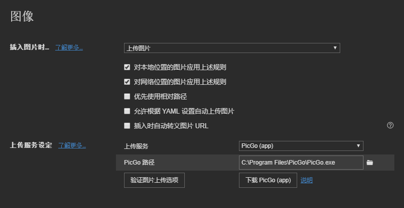 安装PicGo软件,接着图床的搭建,并进行相关的配置,详细步骤我就不多说,请移步我的另外两篇博文: