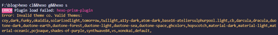 以上代码高亮插件所支持的主题,这是再本地调试运行时代码高亮主题字母写错了,然后提示我的,如下图所示: