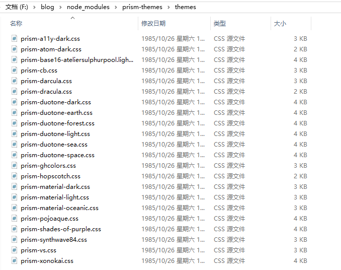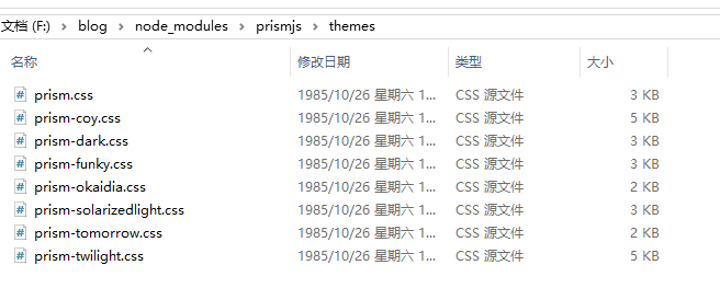 当然你也可以再原有的代码高亮主题的基础上就行DIY,源代码位置:你的博客根目录\node_modules\prism-themes\themes和你的博客根目录\node_modules\prismjs\themes,如下图所示: