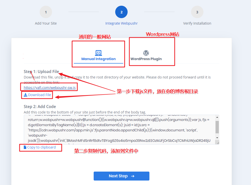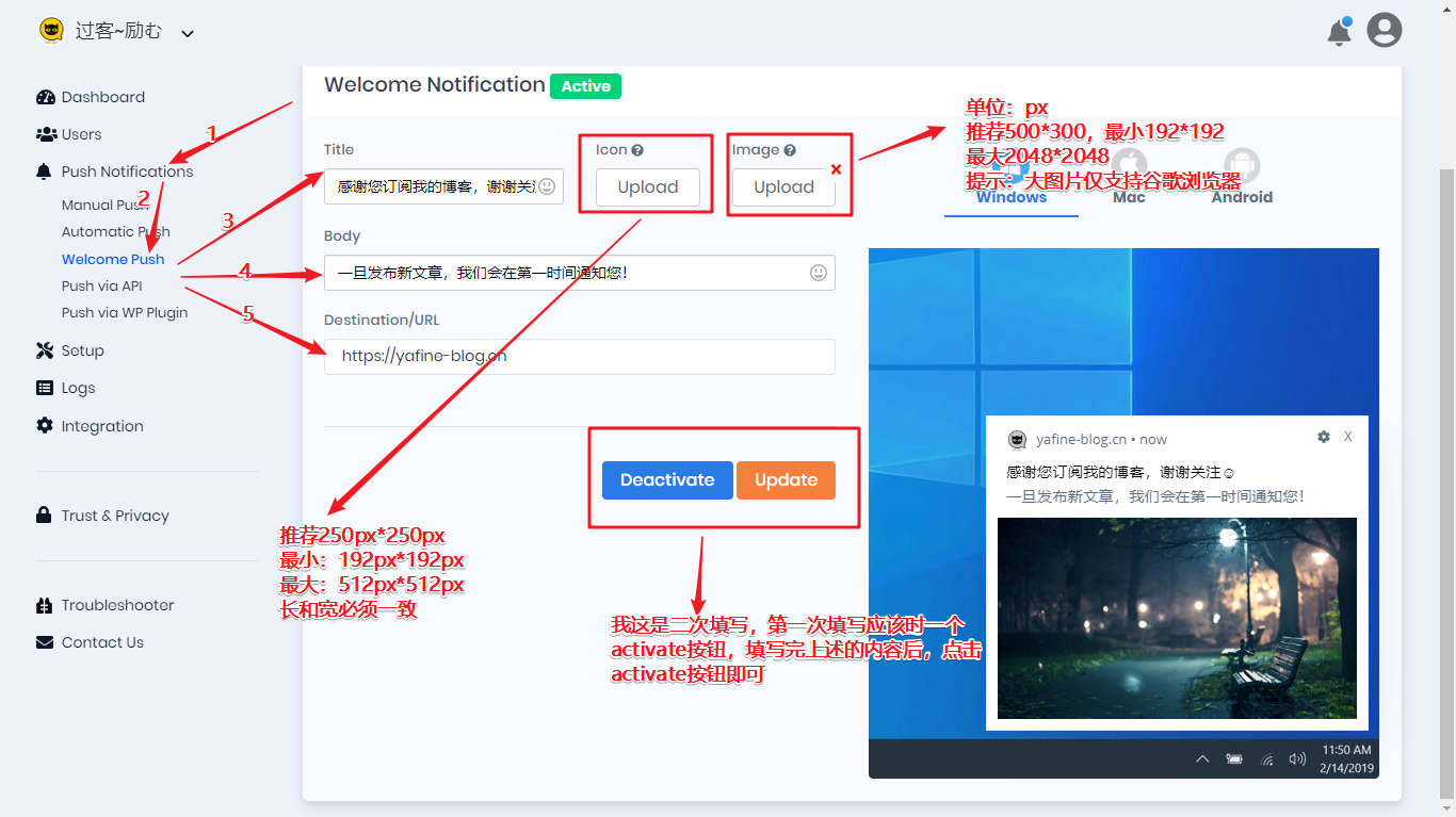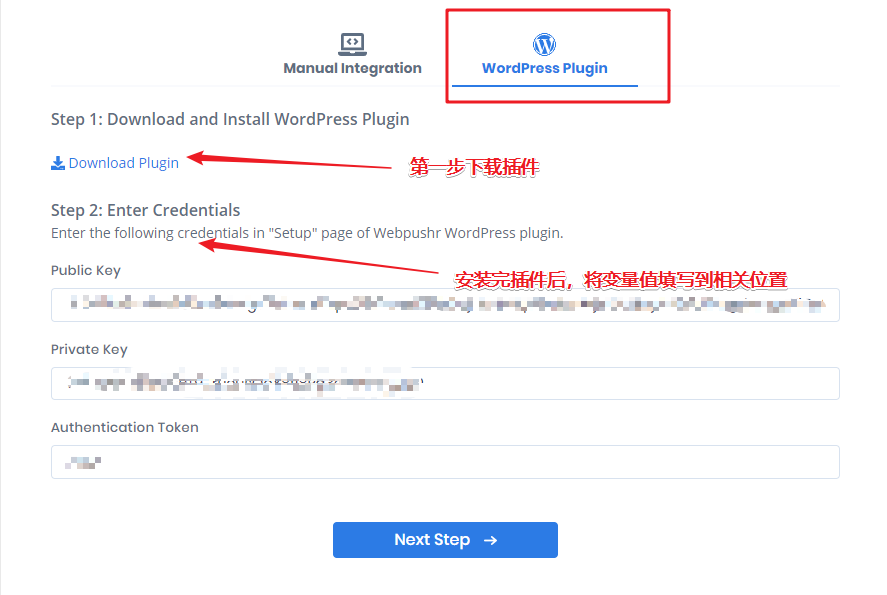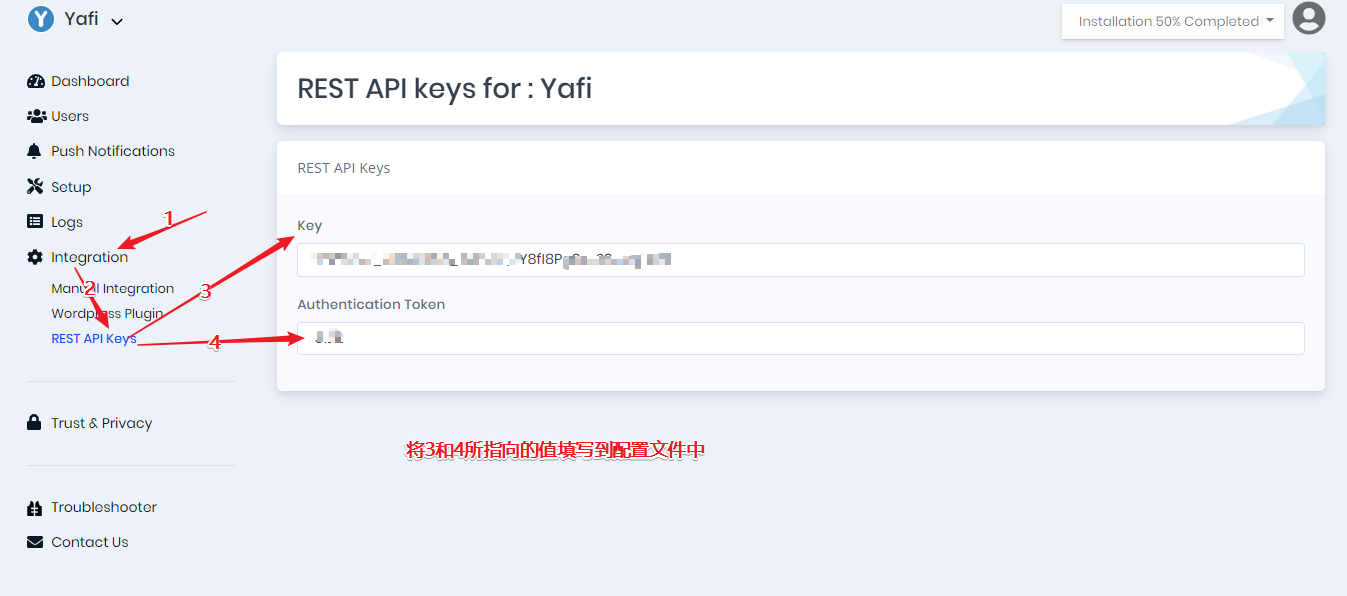 安装成功后,进入主界面,然后按照下图中的引导,找到webpushrKey和webpushrAuthToken的值,并填写到博客根目录的配置文件所对应的位置。