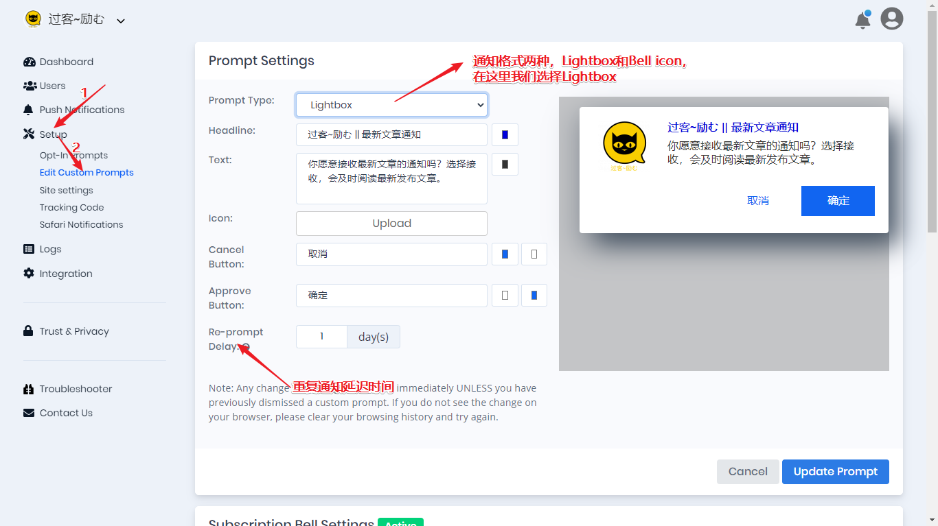 Re-prompt Delay:意思是,如果用户第一次选择取消订阅博客后,经过多长时间,当用户再次打开网站进行推送,征求用户是否订阅博客。
